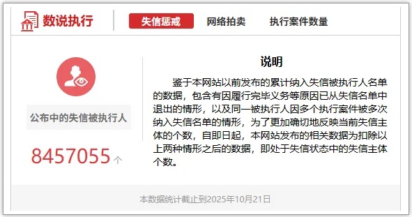 近年来,通过对失信行为综合治理,社会公众法治意识、诚信意识不断提升,执法司法环境不断改善,有力推动了社会信用体系建设。截至目前,我国公布中的失信被执行人数量为8457055个,总人数连续两年呈下降趋势。